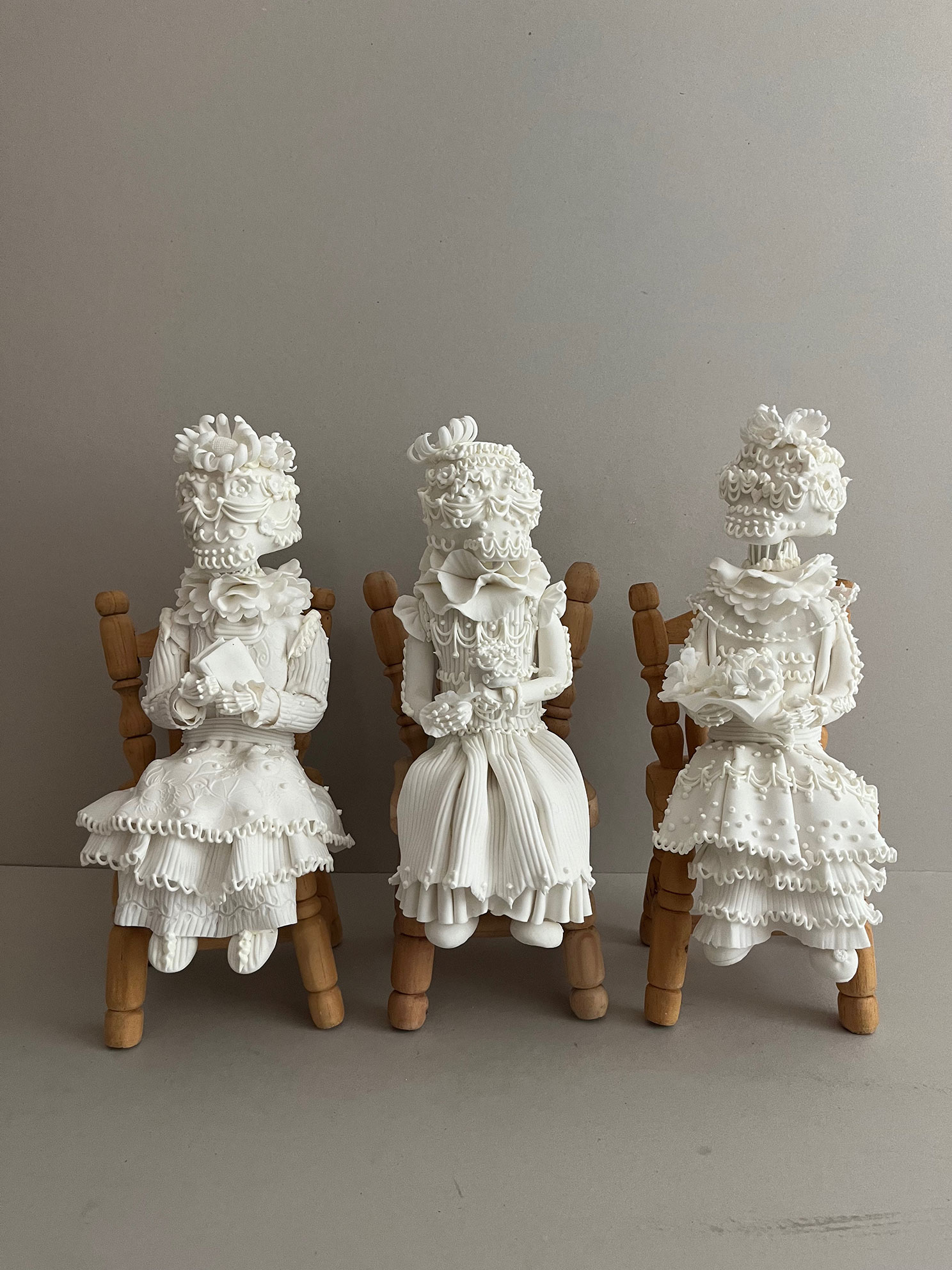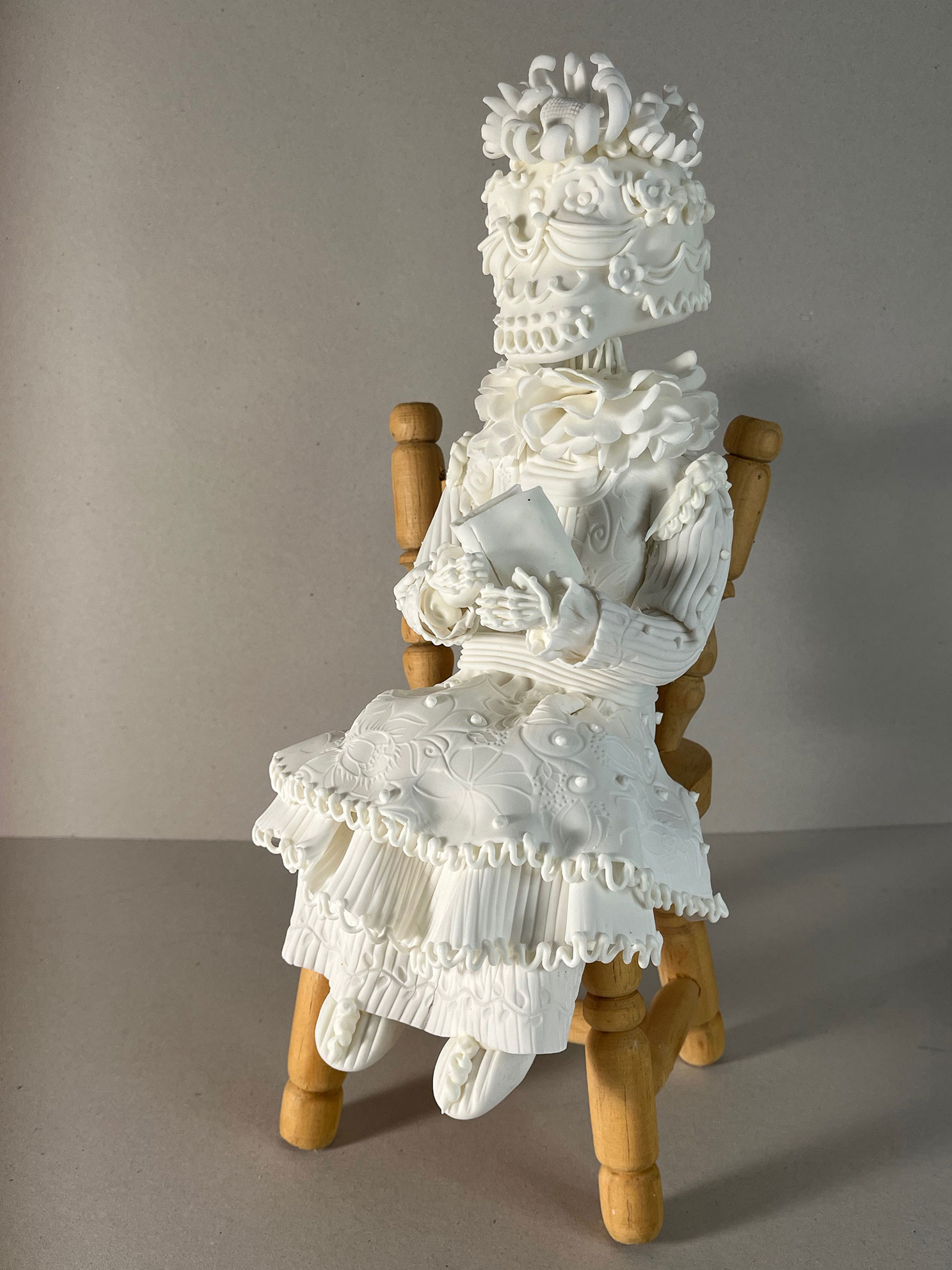 Far from caricature, each Catrina is presented as a stylized and delicate female figure, where ornament, gesture, and posture acquire symbolic meaning. Predominantly monochromatic in character, the works emphasize form, texture, and visual balance, allowing elegance to engage in dialogue with memory and identity.