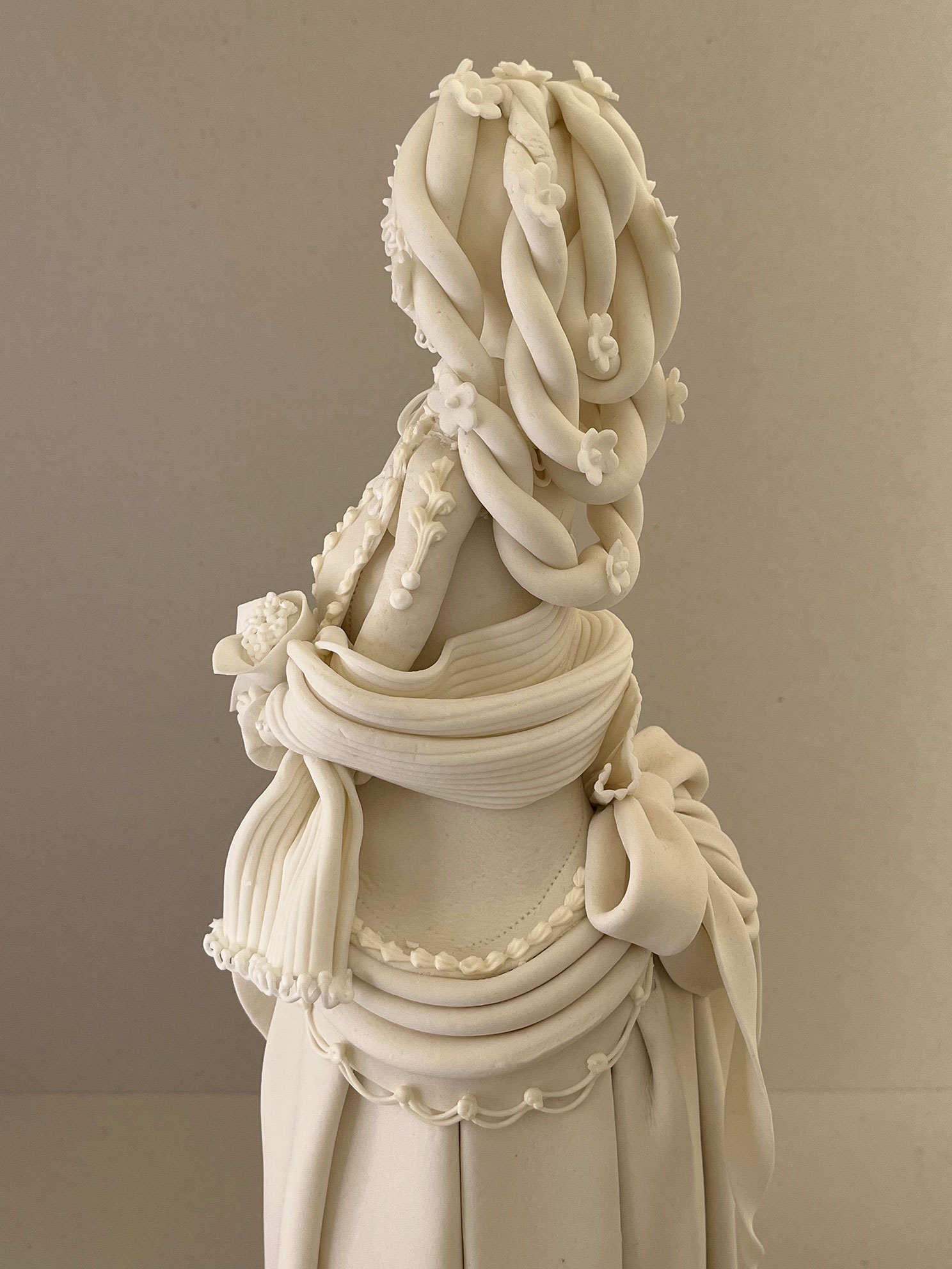 Lejos de la caricatura, cada Catrina se presenta como una figura femenina, estilizada y delicada, donde el ornamento, el gesto y la postura adquieren un significado simbólico. En su mayoría de carácter monocromático, estas obras enfatizan la forma, la textura y el equilibrio visual, permitiendo que la elegancia dialogue con la memoria y la identidad.