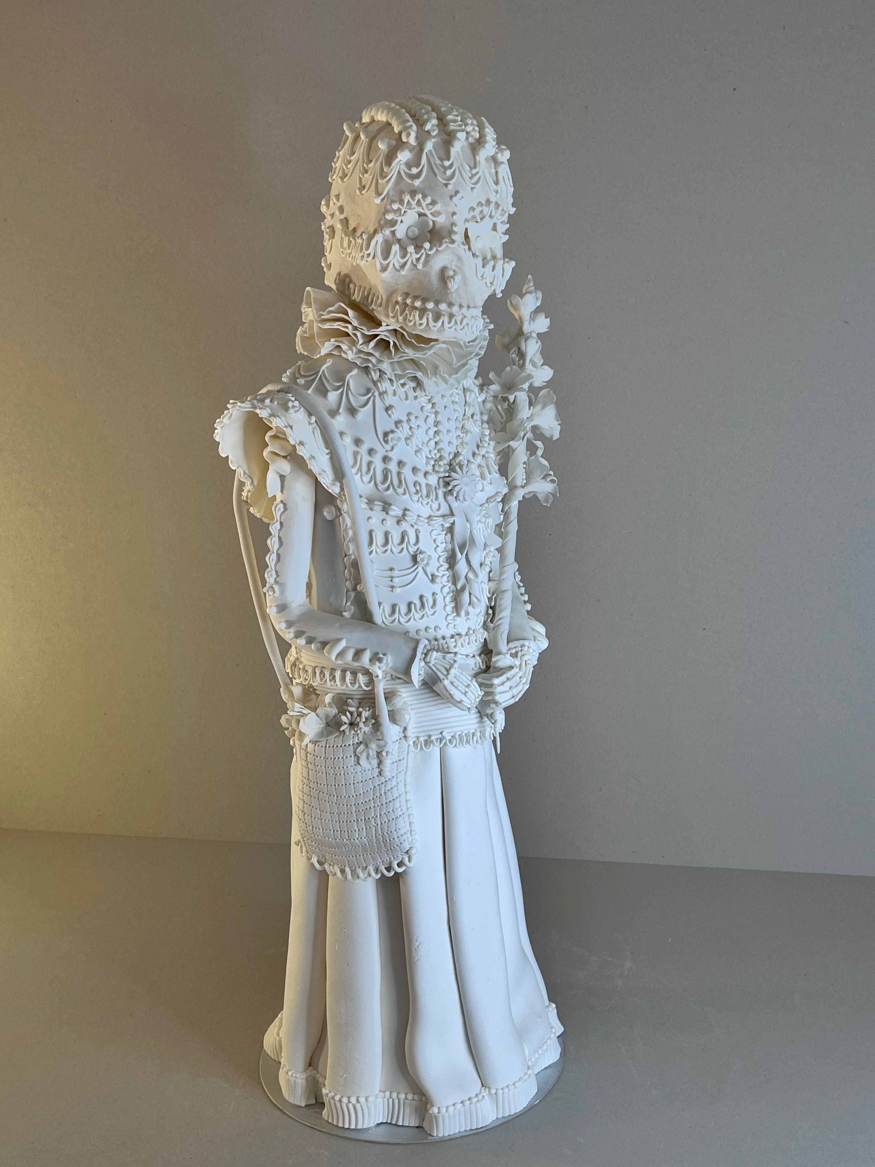 composed of sugar skulls, is a one-of-a-kind piece crafted entirely from sugar using traditional alfeñique techniques, taken to a sculptural scale with a high level of detail. Each figure, while part of a collective scene, is conceived as an individual work within an intimate and solemn composition.